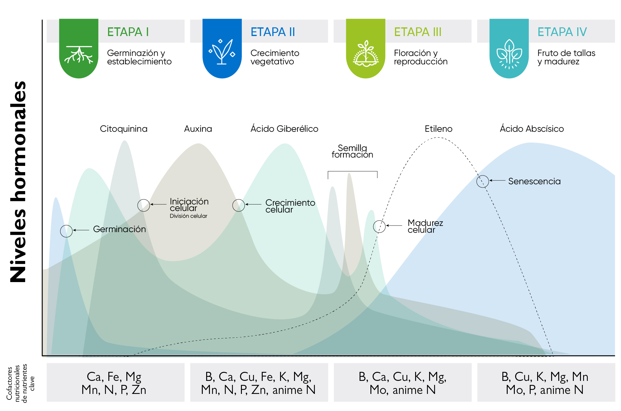 Las plantas necesitan un equilibrio hormonal específico en cada etapa del ciclo. Este balance —entre hormonas promotoras (auxinas, giberelinas y citoquininas) e inhibidoras (ácido abscísico y etileno)— impacta directamente en su desarrollo, productividad y tolerancia al estrés.